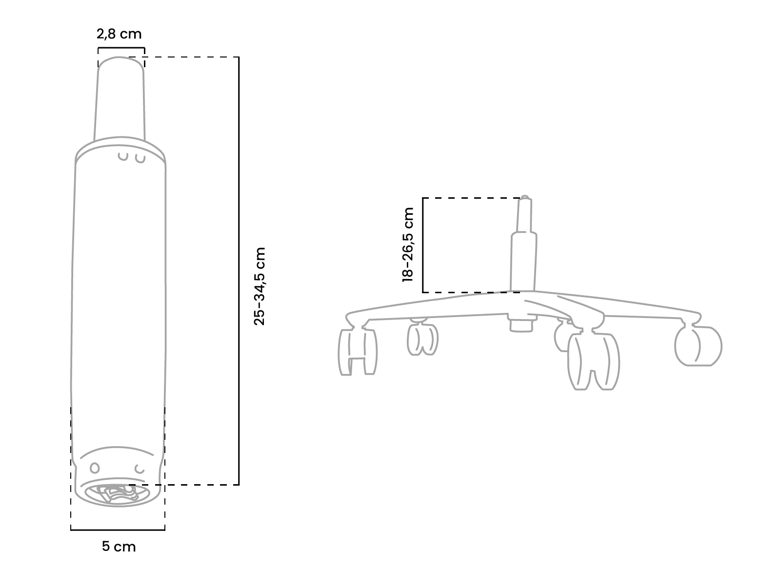 Um sicherzustellen, dass die Höhe Ihrer aktuellen Stuhlhöhe nahekommt, messen Sie den Abstand von der Oberseite des Radkreuzes Ihres Stuhls bis zur Oberseite des Gaslifts und vergleichen Sie ihn mit den unten angegebenen Maßen.