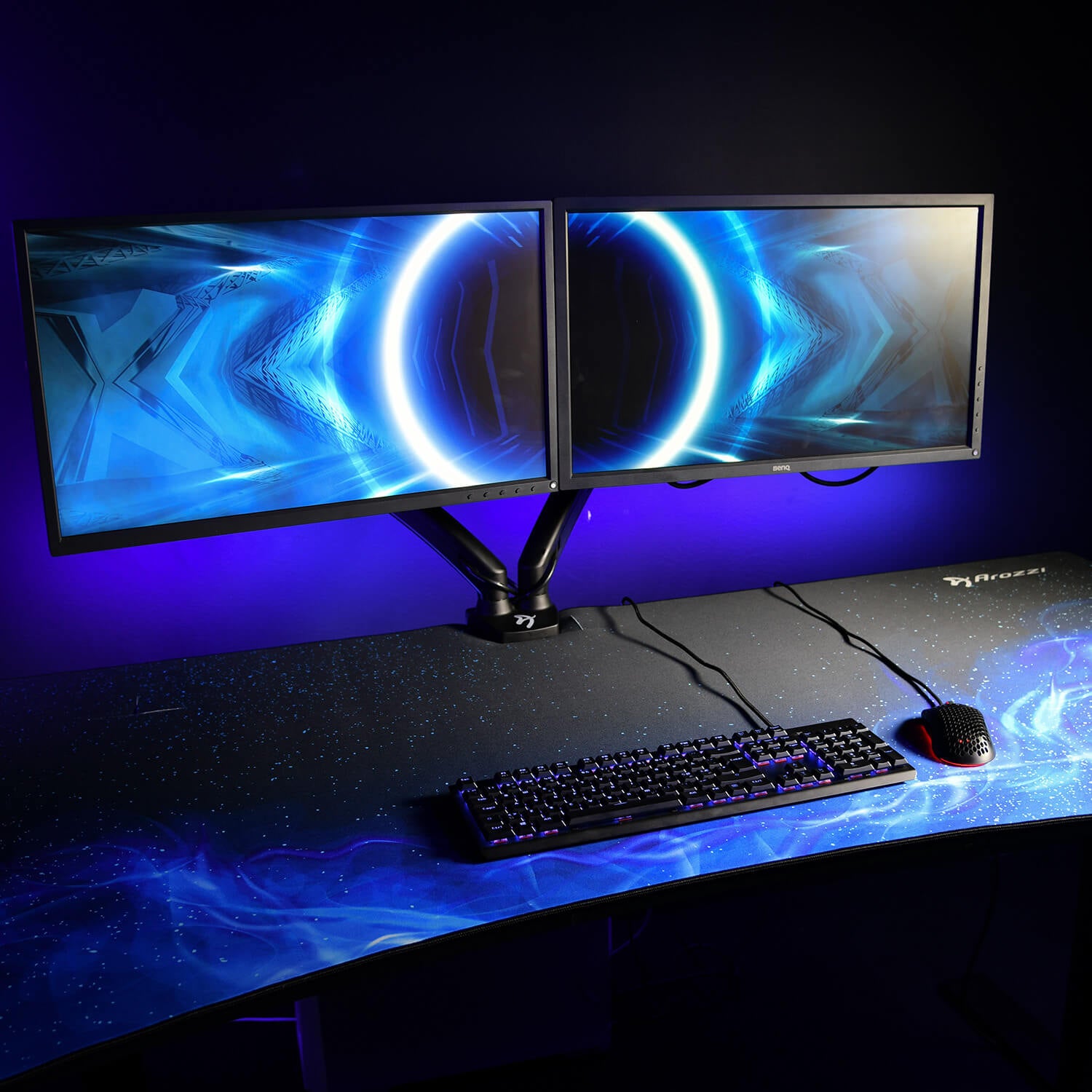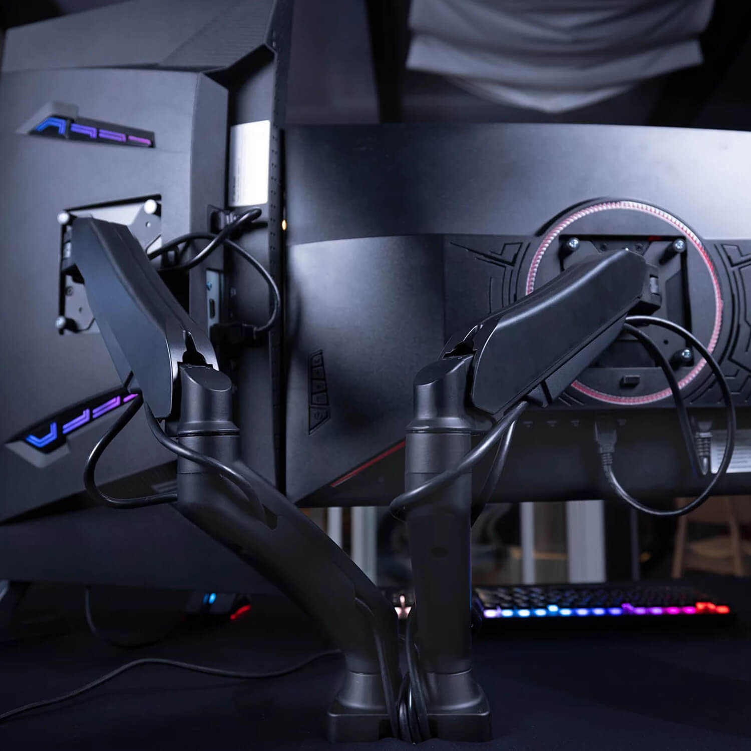 This is our dual monitor arm that will fit any desk, and especially our own Arena desk series. Because of the cut-outs in these desks the arms integrates with the tables in a flawless way.