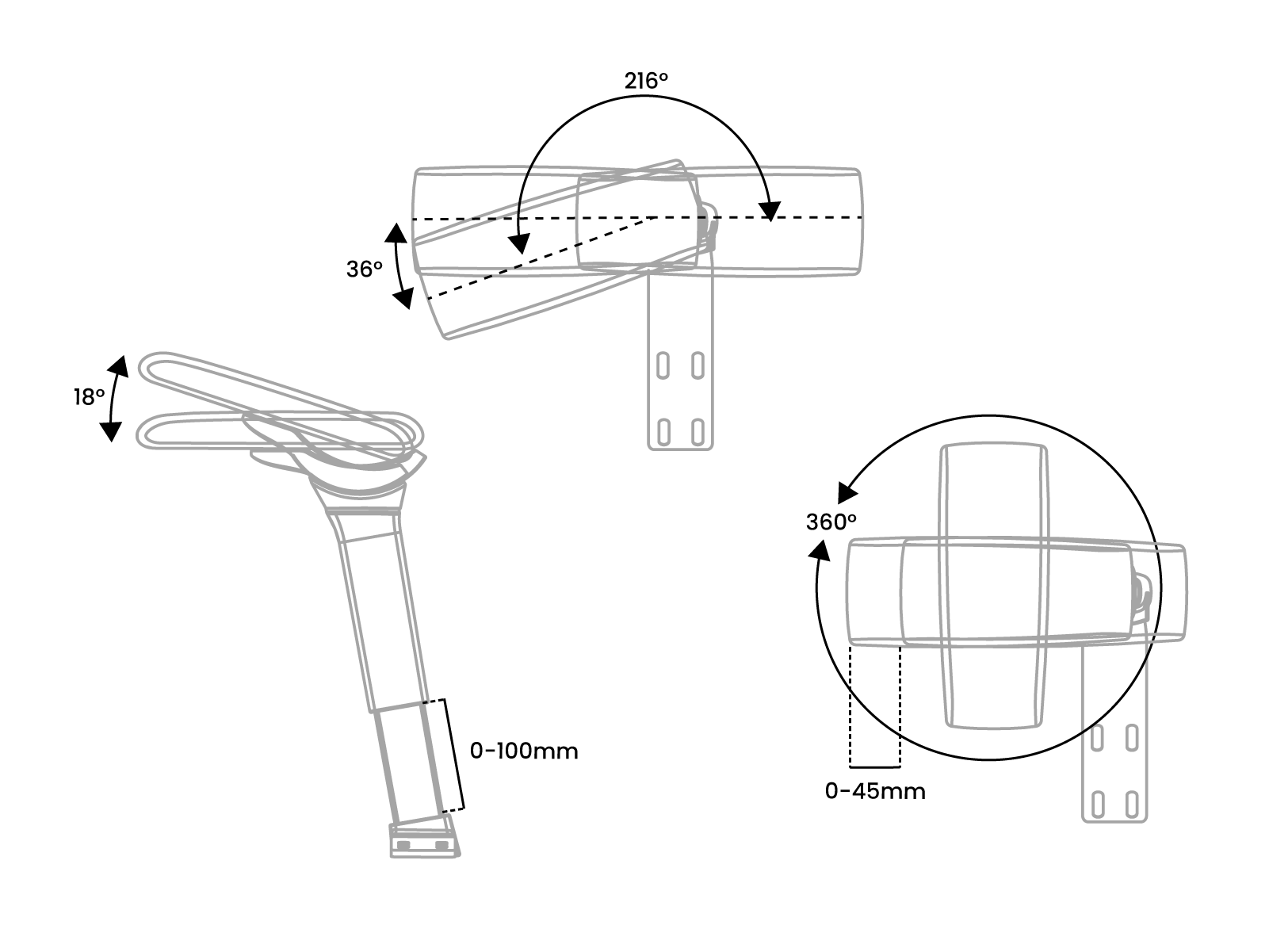 Height: Up & Down, Depth: Forward & Backwards, Width: Inwards & Outwards, Rotation: 360°, Tilt: Adjustable upward and downward